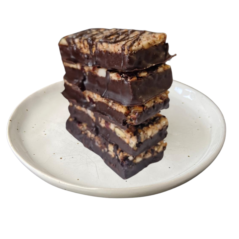 Nutritional Value (per 50g): Calories per bar 275kCal, Protein 5.8g, Carbs 20g, Sugars 15g, Fat 18g, Saturated Fat 5g, Fibre 4.5g, Sodium 50mg.